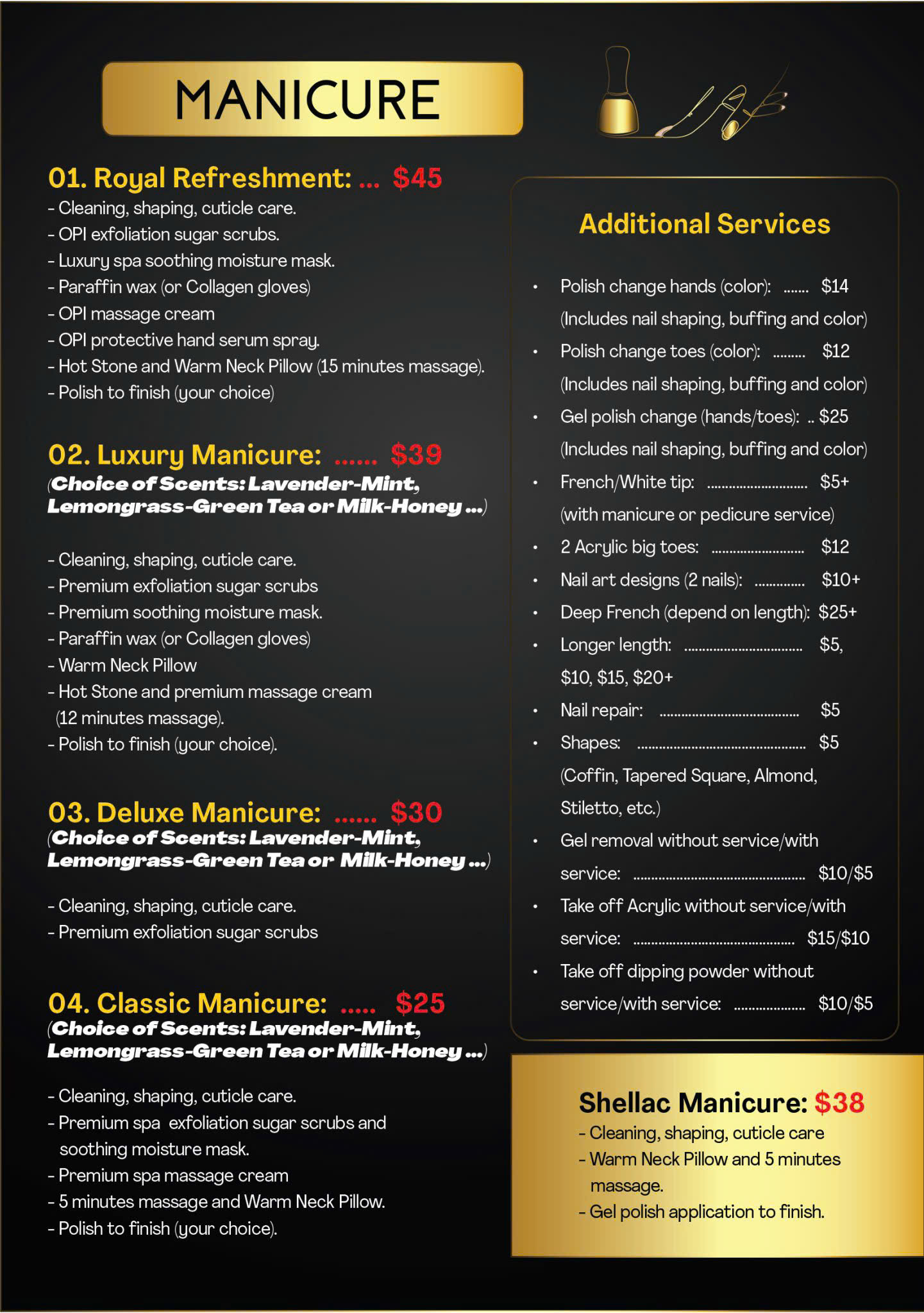 Our spa manicure options will overwhelm you! Choose from regular polish, shellac nails, acrylic nails, gel nails, dipping powder nails, custom designs and more! Not only are you going to walk out with a gorgeous nail set to your liking, our spa manicure also cares for the soft skin on your hand with nourishing serums and hand wraps.